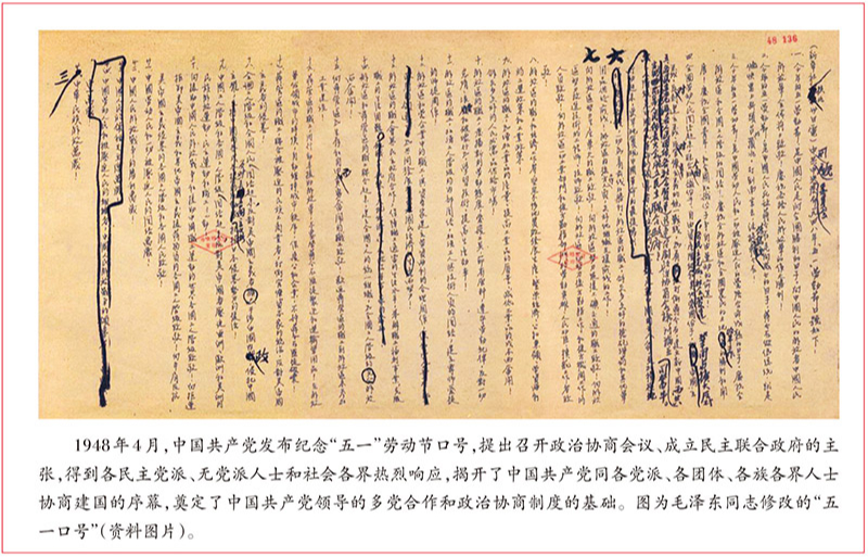 抗日戰(zhàn)爭(zhēng)勝利后,國(guó)民黨瘋狂鎮(zhèn)壓民主運(yùn)動(dòng),主要成立于抗日戰(zhàn)爭(zhēng)和解放戰(zhàn)爭(zhēng)時(shí)期的各民主黨派在反對(duì)國(guó)民黨獨(dú)裁專(zhuān)制、爭(zhēng)取民主自由的斗爭(zhēng)中,逐漸認(rèn)識(shí)到只有中國(guó)共產(chǎn)黨才能救中國(guó),只有跟著中國(guó)共產(chǎn)黨走才有光明前景。他們拋棄幻想,更加堅(jiān)定地選擇與中國(guó)共產(chǎn)黨并肩戰(zhàn)斗。中國(guó)共產(chǎn)黨同各民主黨派建立了親密的合作關(guān)系,真誠(chéng)歡迎各民主黨派參加協(xié)商建國(guó),對(duì)多黨合作態(tài)度堅(jiān)定而明確。1948年4月,中國(guó)共產(chǎn)黨發(fā)布紀(jì)念“五一”勞動(dòng)節(jié)口號(hào),提出召開(kāi)政治協(xié)商會(huì)議、成立民主聯(lián)合政府的主張,得到各民主黨派、無(wú)黨派人士和社會(huì)各界熱烈響應(yīng),揭開(kāi)了中國(guó)共產(chǎn)黨同各黨派、各團(tuán)體、各族各界人士協(xié)商建國(guó)的序幕,奠定了中國(guó)共產(chǎn)黨領(lǐng)導(dǎo)的多黨合作和政治協(xié)商制度的基礎(chǔ)。1949年9月,由中國(guó)共產(chǎn)黨和各民主黨派、人民團(tuán)體、無(wú)黨派民主人士參加的中國(guó)人民政治協(xié)商會(huì)議第一屆全體會(huì)議召開(kāi),通過(guò)了具有臨時(shí)憲法性質(zhì)的《中國(guó)人民政治協(xié)商會(huì)議共同綱領(lǐng)》,標(biāo)志著中國(guó)新型政黨制度的確立。