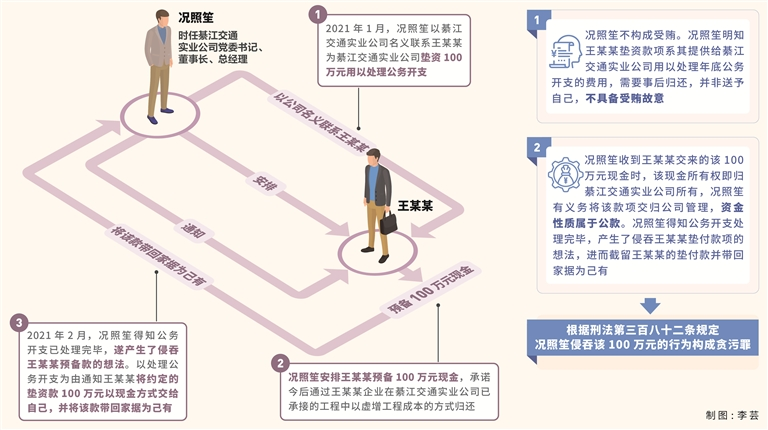 其中,2020年底,況照笙與副總經(jīng)理馬某某商議,安排工作人員唐某從綦江交通實業(yè)公司發(fā)包的工程中套取工程款用以處理年底公務(wù)開支。之后況照笙擔(dān)心唐某套取的資金不夠,于2021年1月以綦江交通實業(yè)公司名義聯(lián)系與綦江交通實業(yè)公司有業(yè)務(wù)往來的私企老板王某某,請其為綦江交通實業(yè)公司墊資100萬元用以處理公務(wù)開支,并安排王某某預(yù)備100萬元現(xiàn)金,承諾今后通過王某某企業(yè)在綦江交通實業(yè)公司已承接的工程中以虛增工程成本的方式歸還。2021年2月,況照笙得知唐某已處理完公務(wù)開支,遂產(chǎn)生了侵吞王某某預(yù)備款的想法,便仍以處理公務(wù)開支為由通知王某某將約定的墊資款以現(xiàn)金方式交給自己,并將該款帶回家據(jù)為己有。2023年12月,王某某告訴況照笙其墊付的100萬元款項尚未歸還,況照笙隨即讓其在承接綦江交通實業(yè)公司的工程中多開100萬元成本發(fā)票報銷。