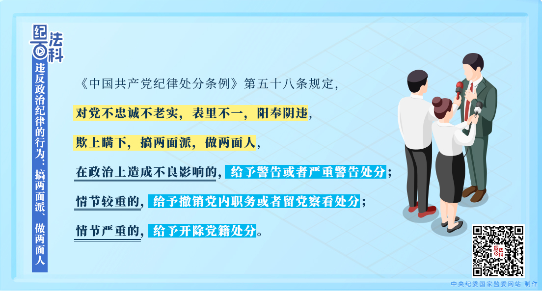 《中國(guó)共產(chǎn)黨紀(jì)律處分條例》第五十八條規(guī)定,對(duì)黨不忠誠(chéng)不老實(shí),表里不一,陽(yáng)奉陰違,欺上瞞下,搞兩面派,做兩面人,在政治上造成不良影響的,給予警告或者嚴(yán)重警告處分;情節(jié)較重的,給予撤銷(xiāo)黨內(nèi)職務(wù)或者留黨察看處分;情節(jié)嚴(yán)重的,給予開(kāi)除黨籍處分。