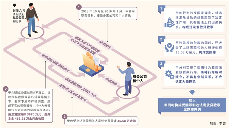 違法發(fā)放貸款罪。2013年10月至2016年1月,甲利用其擔(dān)任A市B區(qū)支行黨委委員、副行長(zhǎng)的職務(wù)便利,接受多家公司和個(gè)人請(qǐng)托,在明知其借款用途不真實(shí)、貸款資料虛假或冒名貸款等情形下,要求下屬不嚴(yán)格調(diào)查、形成不實(shí)的調(diào)查報(bào)告,并作為分管副行長(zhǎng)對(duì)相關(guān)公司和個(gè)人申請(qǐng)的貸款審核通過(guò),違法發(fā)放貸款3670萬(wàn)元,造成本金456.25萬(wàn)余元未收回。